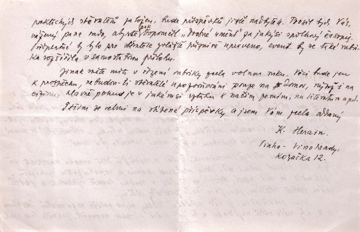 dopis, 29,5 x 21 cm, ručně psaný a podepsaný dopis, volný list, dobrý stav, Provenance: Antiquarian Dlážděná, studied at The Faculty of Education - Charles University in Prague, the disciple of Prof. A. Pelc at The Academy of Arts, Architecture and Design in Prague