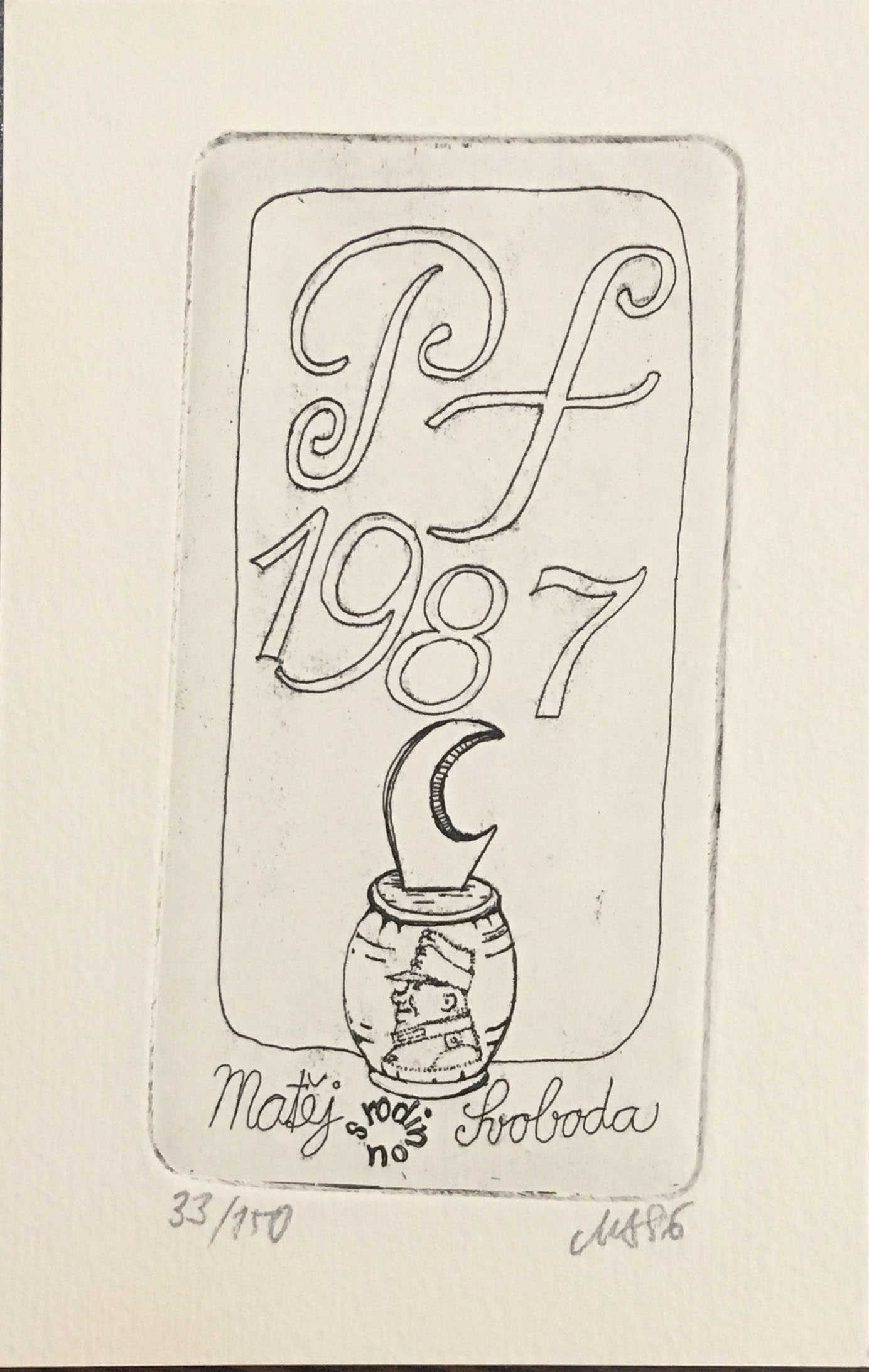 lept, 1986, 11 x 6 cm, PD monogr. MS 86, č. 33/150, the disciple of prof. V. Tittelbach and L. Cepelak at The Academy of Fine Arts in Prague, member of UVU, founder of the group ´68 pod plachtou´ and Tolerance, chairman of The Association of Free Graphic