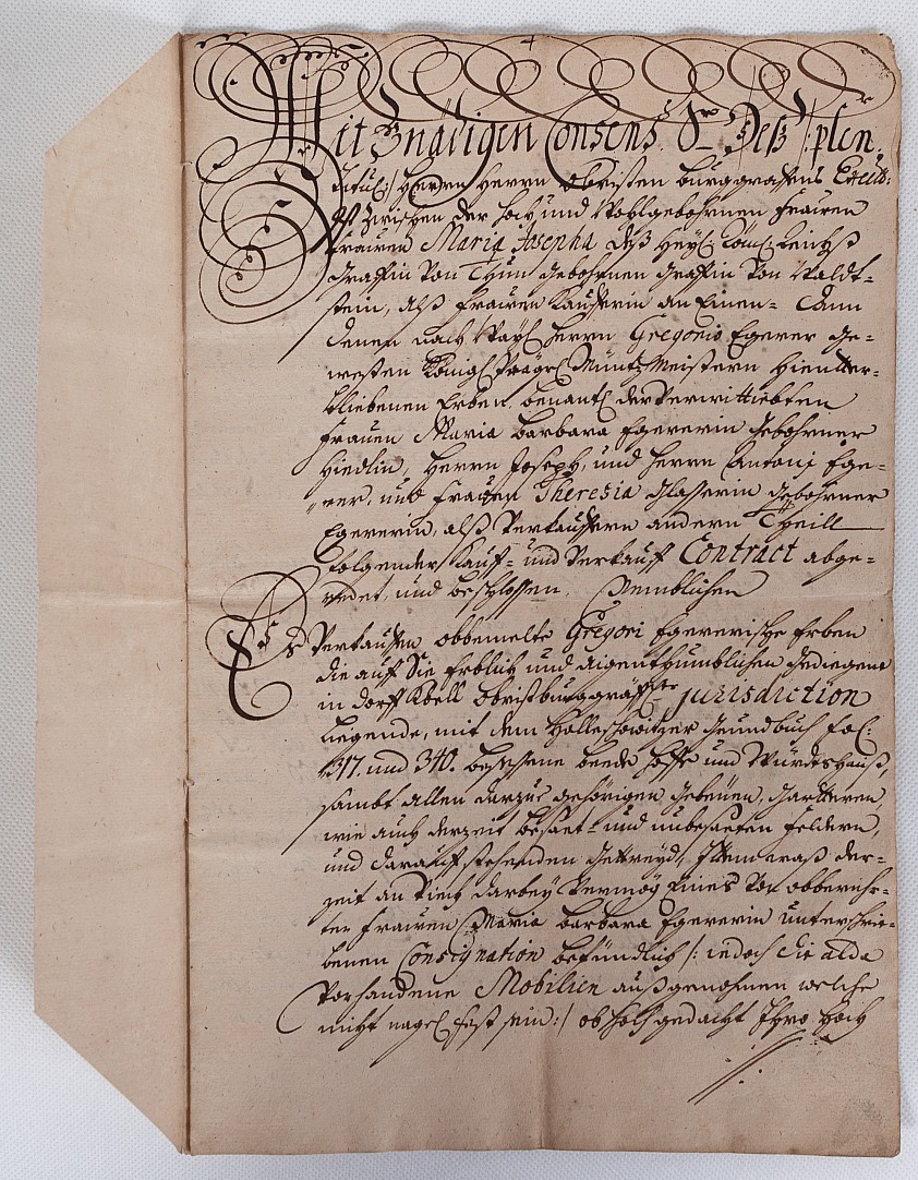 rukopis, 32 x 21 cm, ručně psaný a signovaný rukopis, r. 1718, 6x signatura a červená vosková pečeť, podepsán Leopold Vilém II. z Valdštejna, sign. je pravděpodobně Marie Josefa Habsburská (manželka polského krále Augusta III. Polského), aj., na zadní straně přípis se signaturou a pečetí, 4 šité str…
