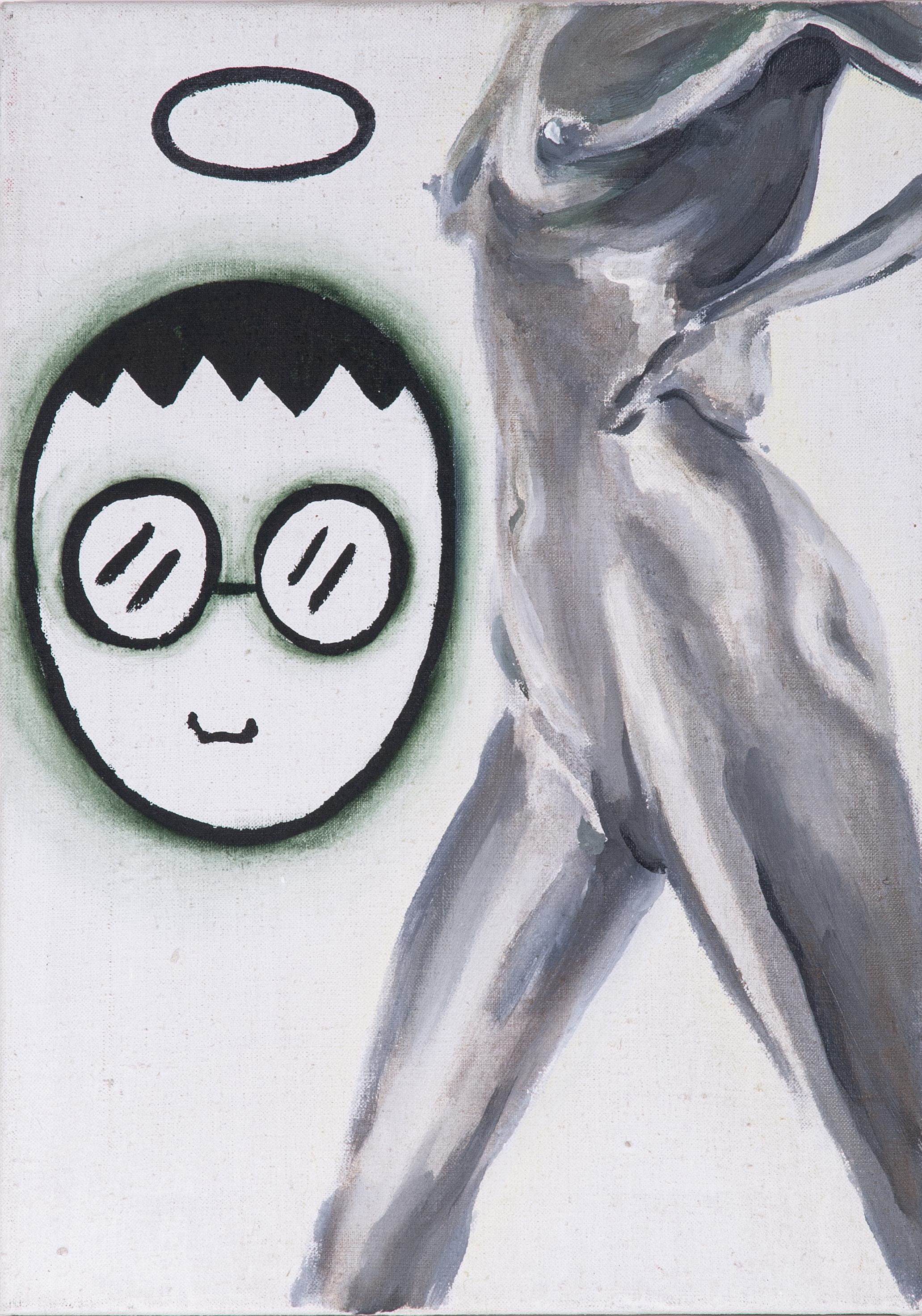 olej, plátno, 2023, 60 x 50 cm, sign. vzadu Lukáš Miffek, Lukáš Miffek je absolventem ateliéru malby u prof. Střížka a prof. Rittsteina a člen skupiny Natvrdlí. Ve své tvorbě si dokázal vytvořit zcela originální svět obývaný vyzývavými ženami, hrachovými lusky, kaktusy, fast foodem, roboty a dalšími…