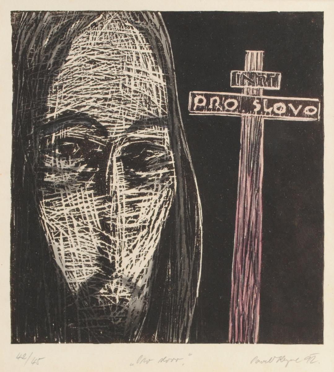 dřevoryt, akvarel, papír, 1992, 20 x 18 cm, sign. PD Pavel Kryml 92, rám, č. 42/45, pasparta mírně zašlá, na rámu drobné oděrky, Aantiqari.at Radhošťská,
