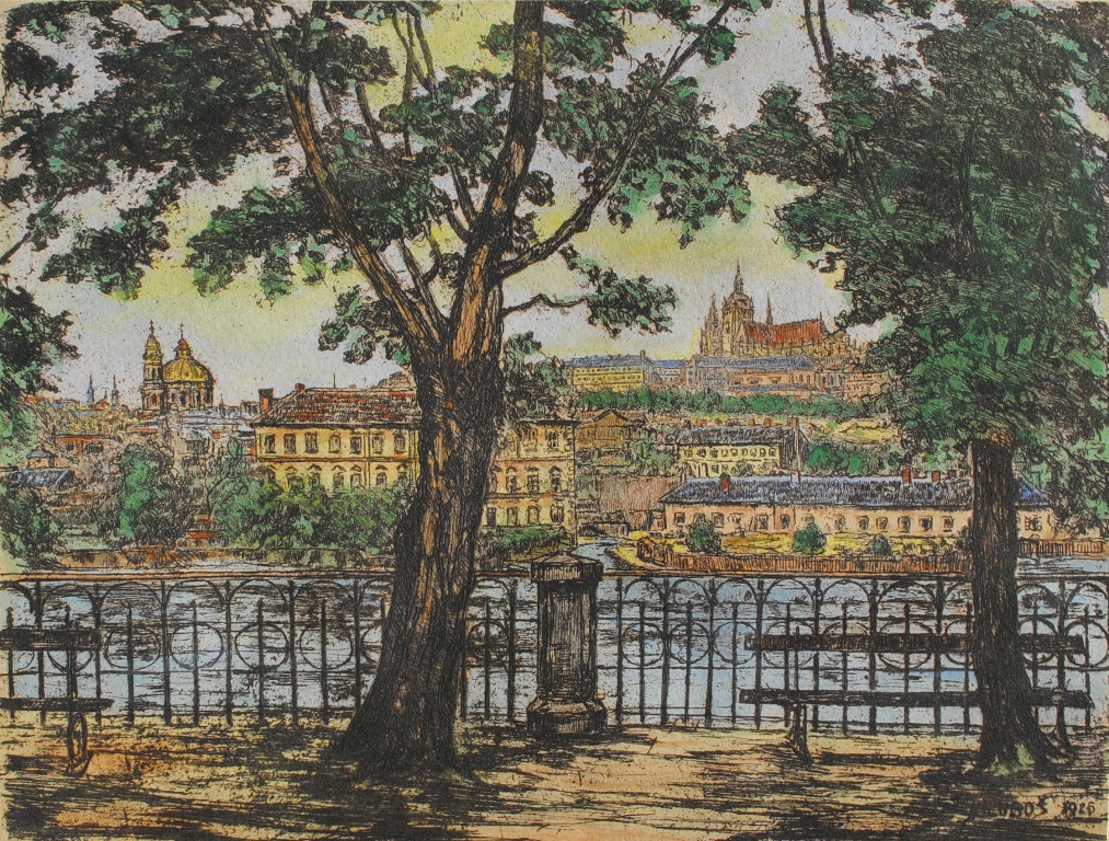 suchá jehla, kolorováno, 1926, 22,5 x 28 cm, značeno v desce PD Luboš 26, nalepeno na tvrdém papíru, papír na kterém je grafika nalepena je zažloutlý, místy s flíčky a na dvou místech perforován, Aantiqari.at Radhošťská,