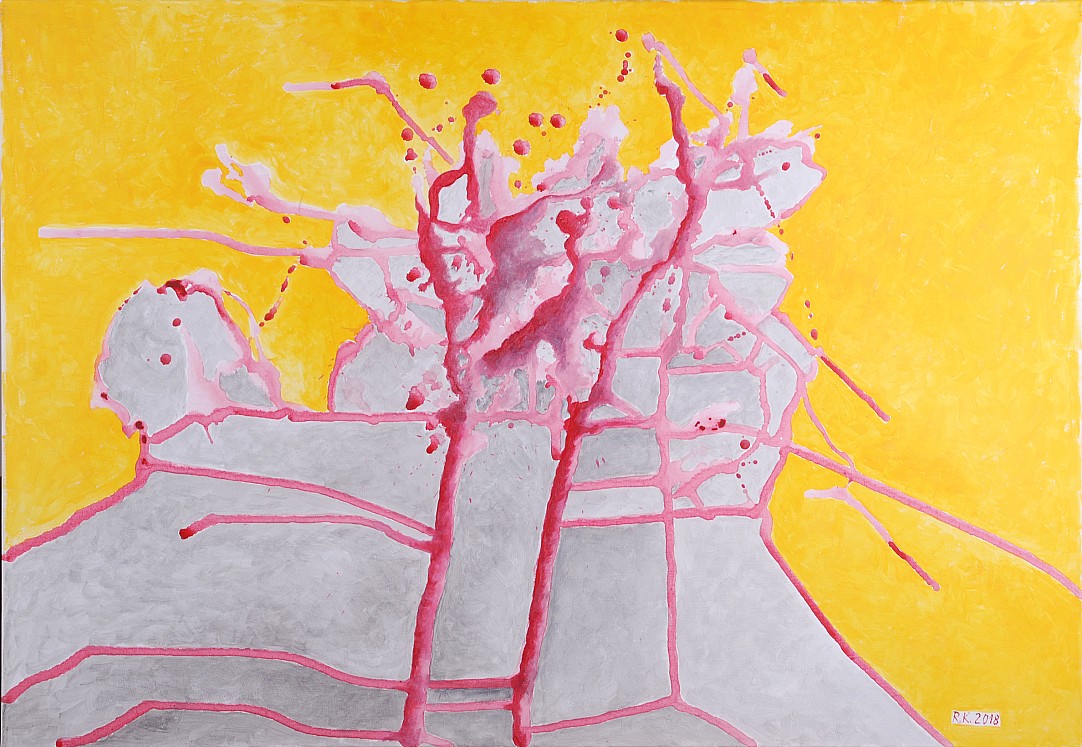 akryl, plátno, 2018, 70 x 100 cm cm, sign. PD R. K. 2018 a na zadní straně Kudrnáček, klínový rám, na zadní straně štítek autora, Provenance: Antiquarian Dlážděná