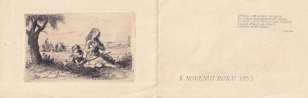 lept, 1952, 6,5 x 10 cm, text na druhé straně: Zpívám zpěv míru. Do boje, za mír a za budoucnost světa, za květ jejž dívka v copy vplétá, za lidi, písně, za stroje. Zpívám zpěv míru., Provenance: Antiquarian Dlážděná