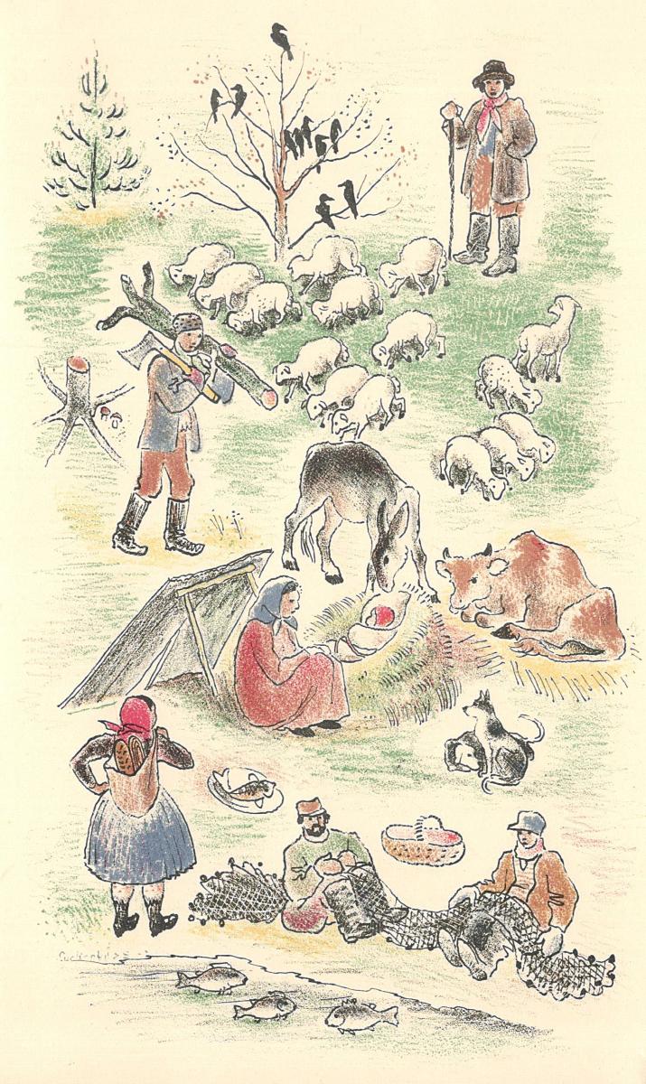 suchá jehla, 1943, 13 x 6,5 cm, sign. PD, papír uprostřed přeložen: na levé straně grafika, na pravé straně Evangelium podle Lukáše 2, 1-14, u signatury hnědá skvrnka, Aantiqari.at Radhošťská,
