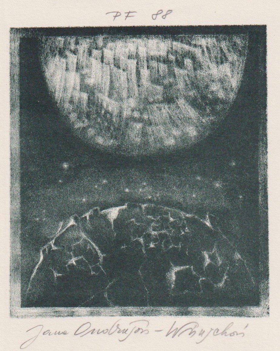 litografie, 10,5 x 8,4 cm, sign. PD, papír uprostřed přeložen - na pravé půlce papíru grafika, na levé PF 1977 Dr. Václav Šmejkal, papír zašlý a u horního okraje ušpiněn, Aantiqari.at Radhošťská,