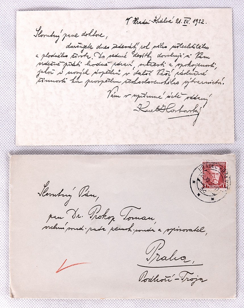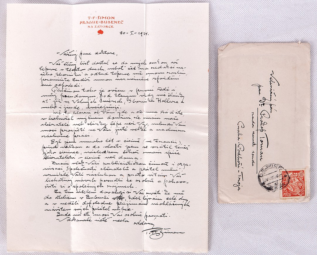 dopis, 1924, 25,8 x 20,8 cm, Rukopisný signovaný dopis Prahy-Bubenče z 20.I.1924, v původní obálce. , Provenance: Antiquarian Dlážděná, the disciple of prof. M. Pirner at the Academy of Fine Arts in Prague, member of Hollar, SVU Mánes, Société du Salon d'Automne and Salon National des Beaux Arts