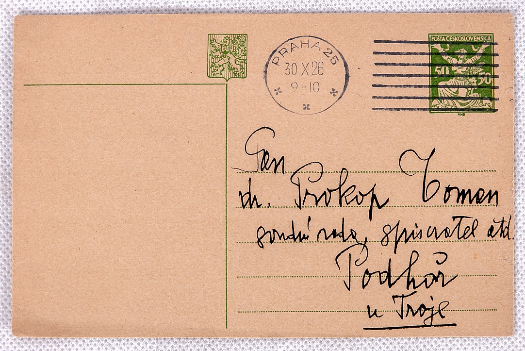dopisnice, 1926, 14 x 9 cm, Rukopisný vzkaz s podpisem z 30.X. 1926, Provenance: Antiquarian Dlážděná