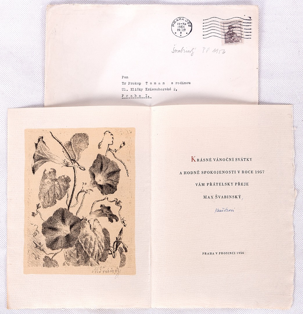 dopis s grafickým listem, 1956, 22 x 30,5 cm, Novoroční přání a PF 1957 s litografií Maxe Švabinského (15,5 x 12 cm), tištěno na ručním papíře, věnování ručně Kaušitzovi, v pův. obálce, 19.XII.1956 Praha, Provenance: Antiquarian Dlážděná, the disciple of prof. M. Pirner, J. Marak and E. Karel at The…