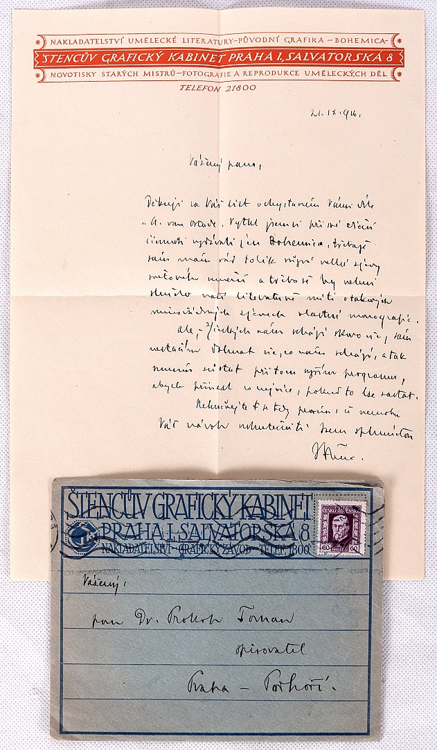dopis, 1916, 27,5 x 20 cm, Rukopisný signovaný dopis Prahy z 21.IX.1916, v původní obálce. Tématem listu je Štencova reakce na Tomanův podnět ohledně vydání díla Adriaen van Ostade., Provenance: Antiquarian Dlážděná