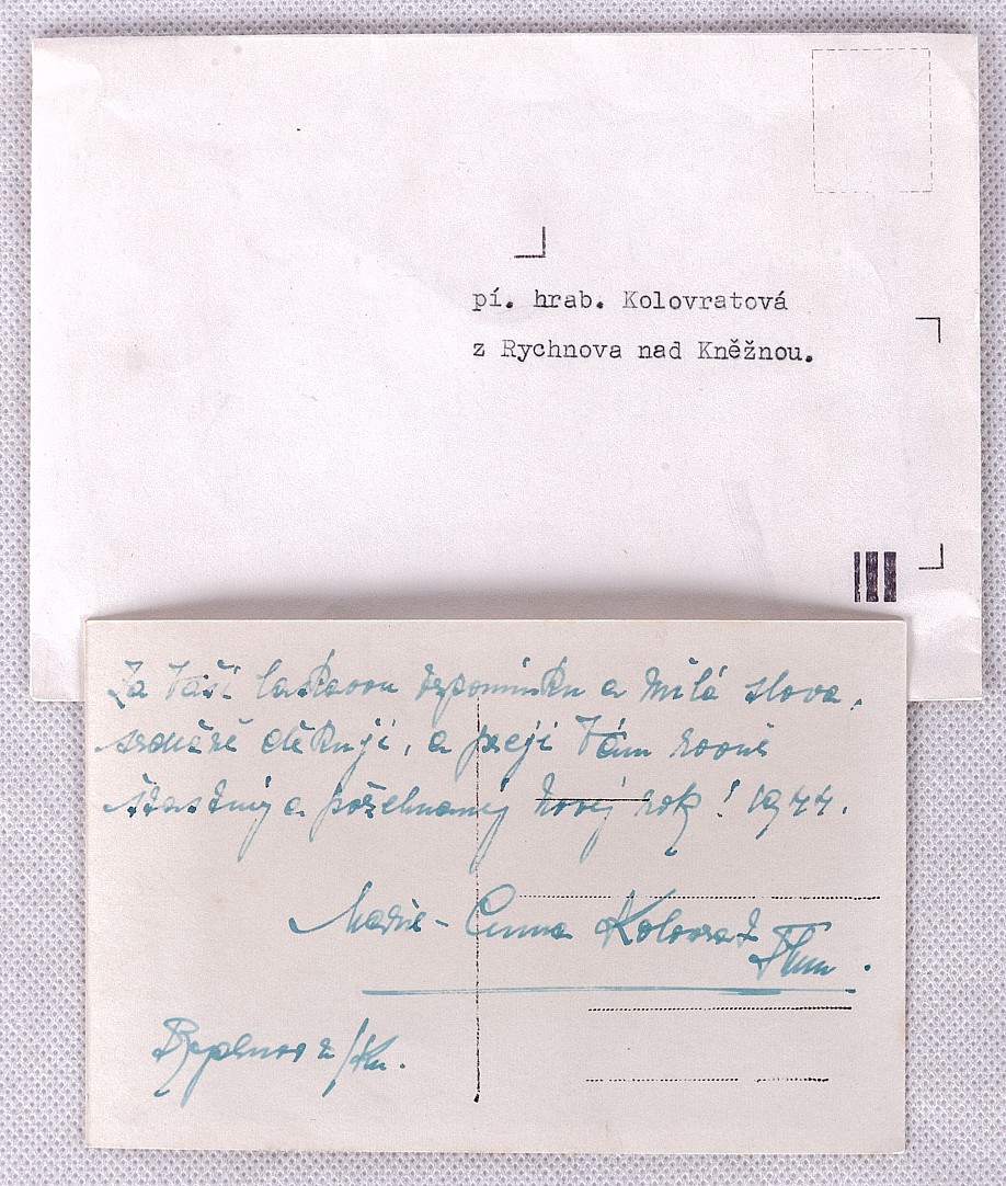 pohlednice, 1944, 9 x 14 cm, Vlastnoručně psaná pohlednice odeslaná z Rychnova nad Kněžnou, v nepův. obálce značené pí. hrab. Kolovratová z Rychnova nad Kněžnou, Provenance: Antiquarian Dlážděná