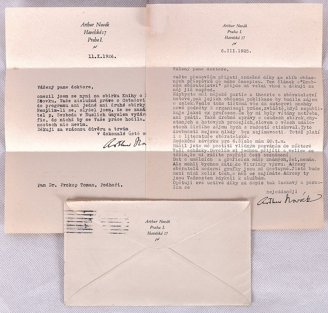 2x dopis, 1925, 20,5 x 16 cm, Dva strojopisné dopisy s podpisem z 6.III.1925 a 11.X.1926, 1x původní obálka s razítkem Arthur Novák Praha 1 Havelská 17. Redaktor Hollaru, překladatel, redaktor, kritik, bibliofil., Provenance: Antiquarian Dlážděná