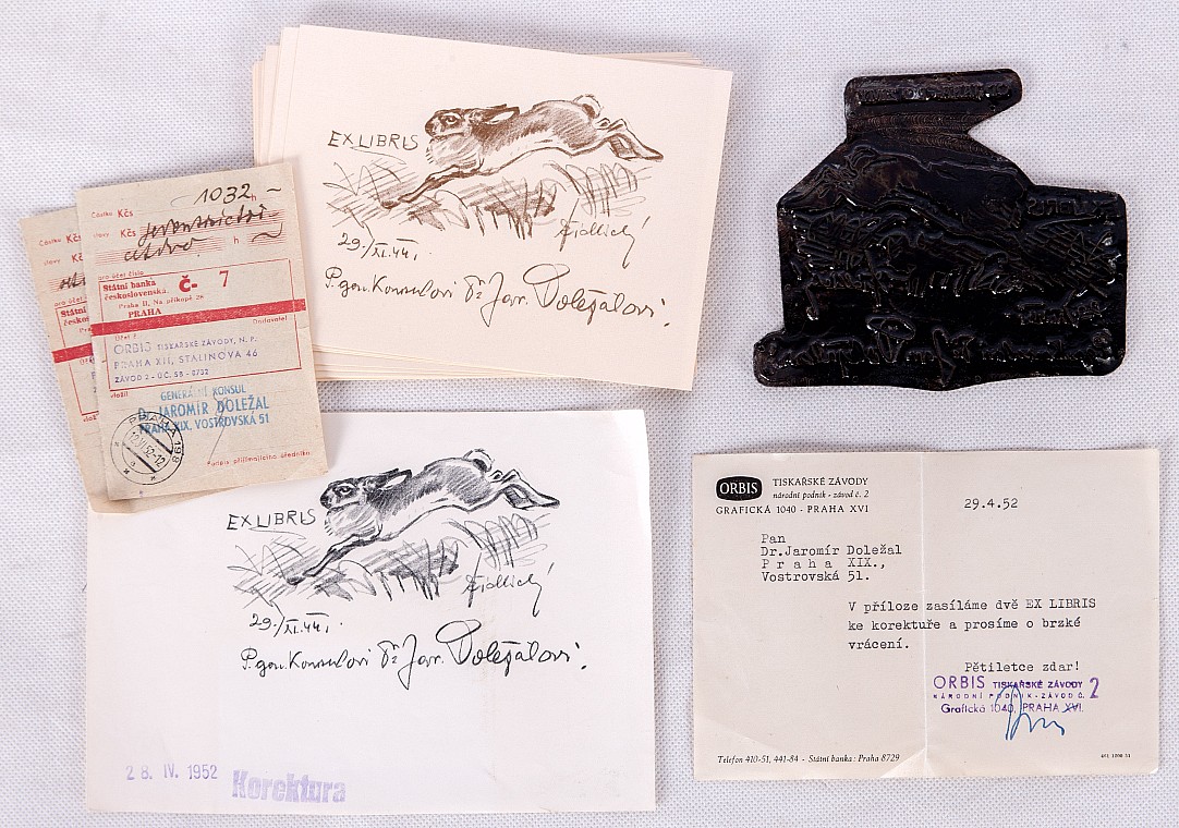 štoček a 43 exlibris, 1944, 10,5 x 12,5 cm, značeno PD v desce Židlický, kovová grafická deska pro tisk ex libris Panu generálnímu konsulovi Jaromíru Doležalovi, přiloženo 43 ex libris pořízených z desky, Provenance: Antiquarian Dlážděná