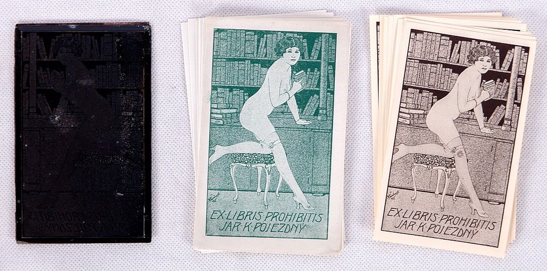 štoček a 72x ex libris, 9 x 4,5 cm, monogr. PD v desce A, kovová grafická deska pro tisk ex libris Dr. Jaromíru Doležalovi (pseudonym J. K. Pojezdný), přiloženo 72 ex libris pořízených z desky, Provenance: Antiquarian Dlážděná