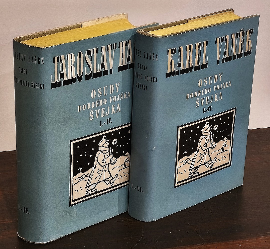 2x kniha, dvousvazkové exilové vydání Osudů vojáka Švejka od J. Haška (I.-IV.) a Karla Vaňka (druhá kniha, V.-VI.) s ilustracemi Josefa Lady, vyd. International Book Service Ltd., Montreal, 1952, 629+367s., 2x. pův. clpl. vazba s ob., oba svazky, včetně obálek, ve velmi dobrém a krásném stavu!, Aant…