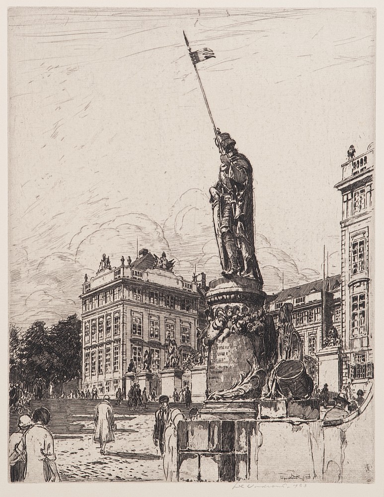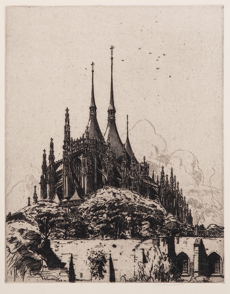 akvatinta, 17,4 x 13,2 cm, sign. PD Alois Kalvoda, V upomínku na Jednotu policejních pensistů a vdov stráže bezpečnostní v ČSR, při okrajích mimo tisk mírně zašpiněný papír, Provenance: Antiquarian Dlážděná, disciple of Prof. J. E. Mařák at the Academy of Fine Arts in Prague, member JUV, SVU Manes a…