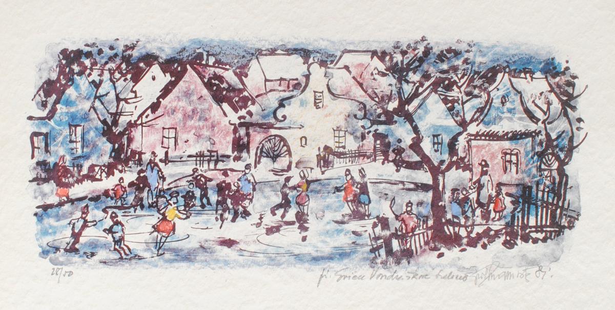 serigrafie, 1984, 25 x 15 cm, sign. PD a věnování Ota Janeček 15.8.84, rám, Provenance: Antiquarian Ostrovní, the disciple of prof. O. Blazicek, C. Bouda and K. Pokorny, member of The Manes Association of Fine Artists, The Hollar Association of Czech Graphic Artists