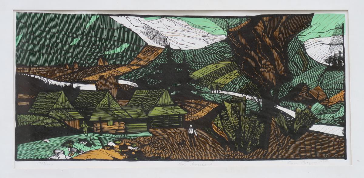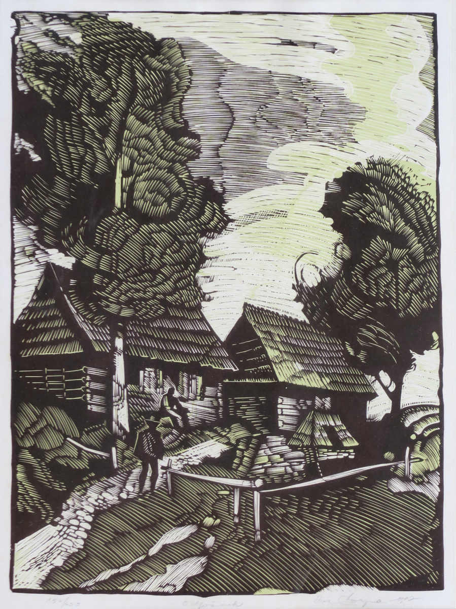 dřevořez, 40,5 x 19,8 cm, sign. PD Hermína Melicharová, č. 87/150, lehce zažloutlý papír, horní a spodní okraj papíru pokrčeny, na pravém okraji papíru několik drobounkých narezavělých flíčků (nezasahuje do tisku), Aantiqari.at Radhošťská, , the disciple of prof. J. Benda and prof. A. Strnadel at Th…