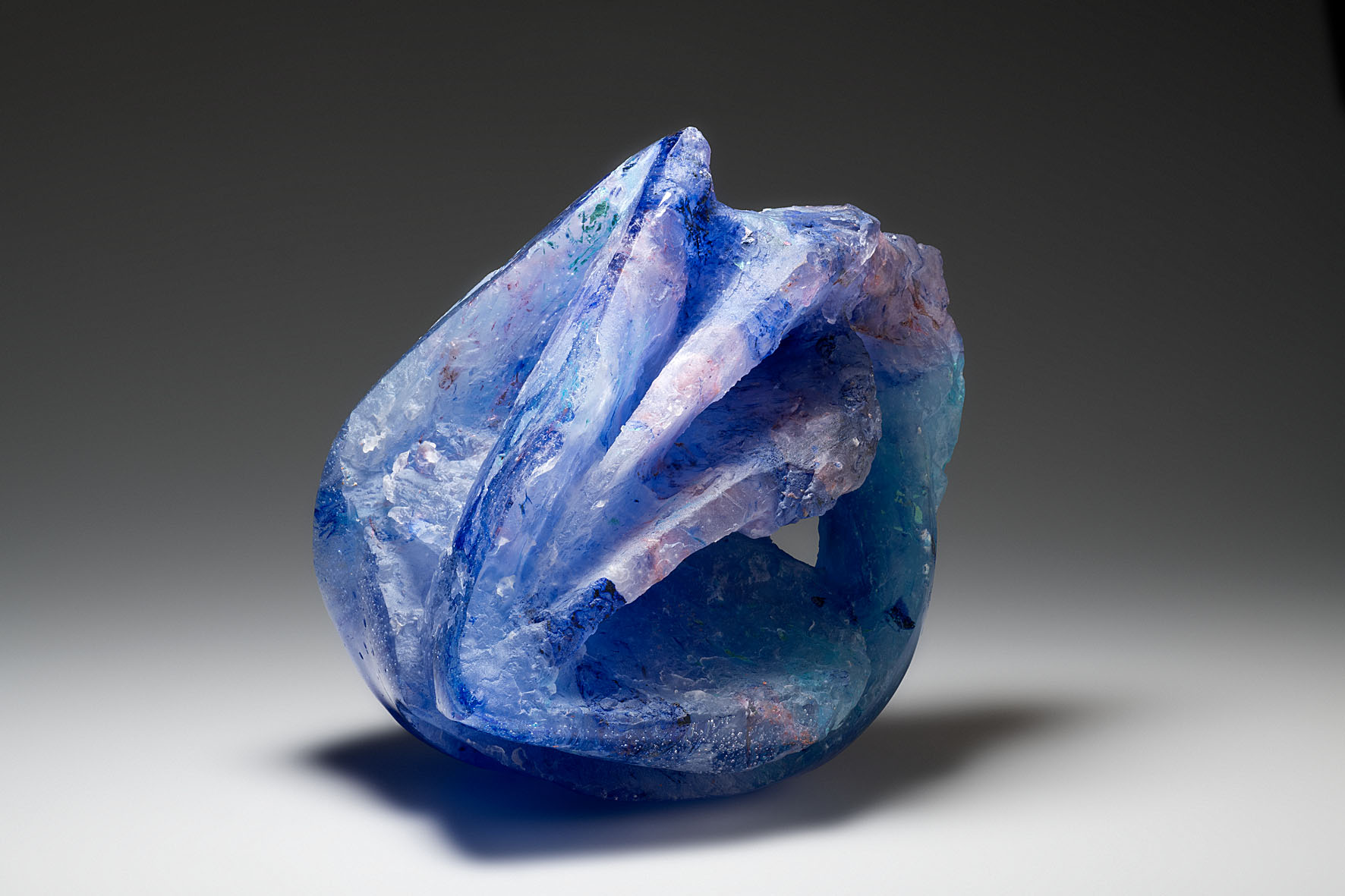 do formy tavené sklo, barevné pigmenty, broušené, částečně leštěné; 12 kg, 1994, v. 24; š. 25; h. 27 cm, dole