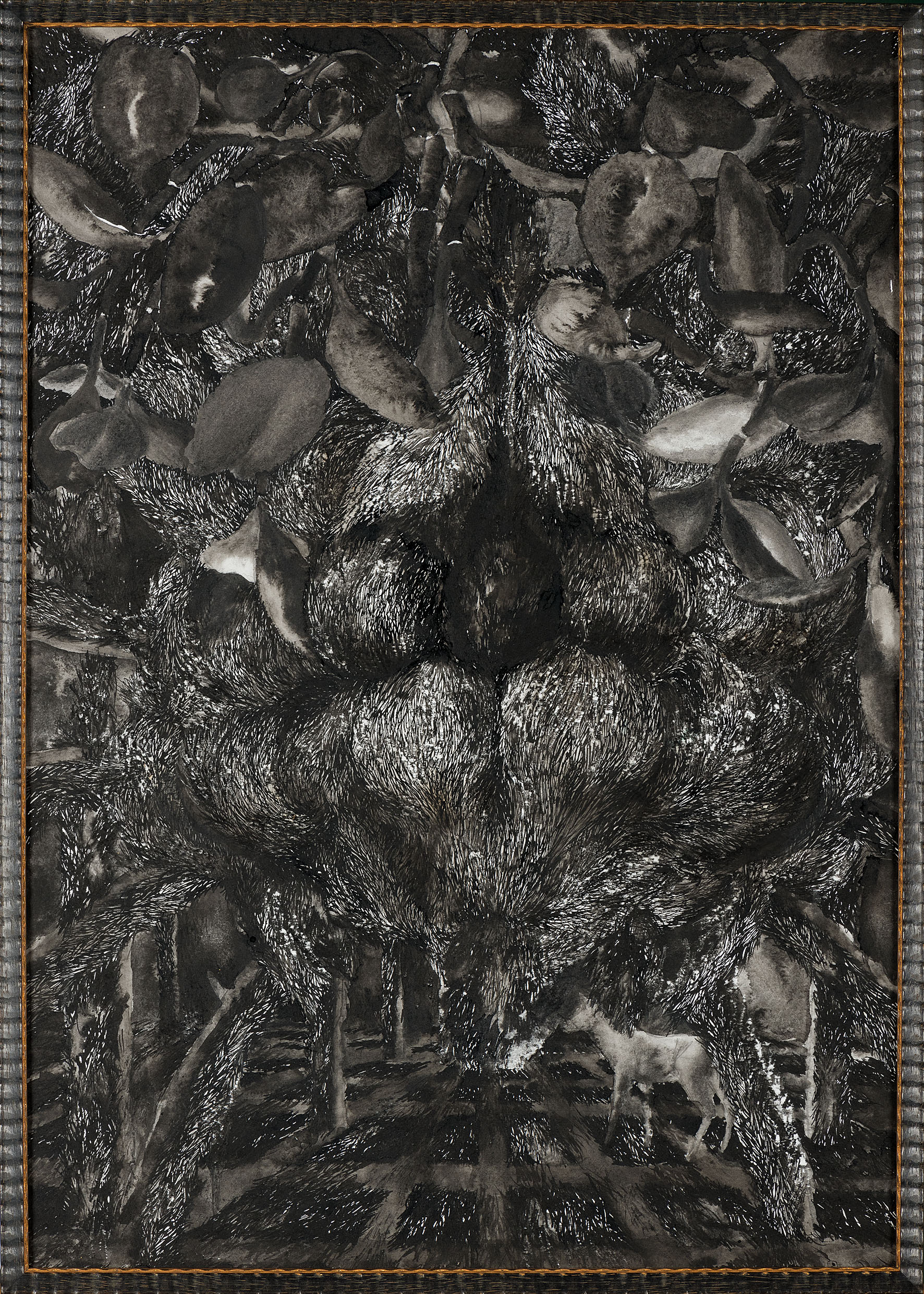 tuš, uhel a oheň, 2024–2025, 59 x 42 cm, PD, v rámu pod muzeálním sklem