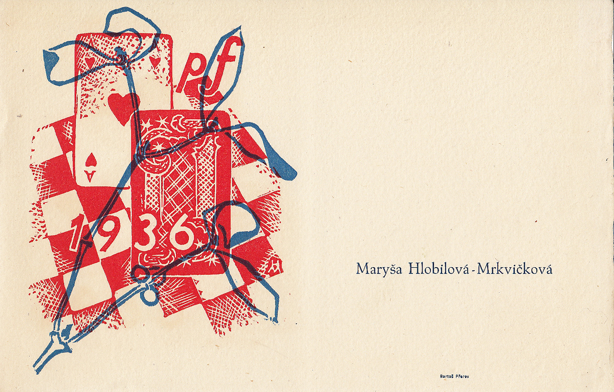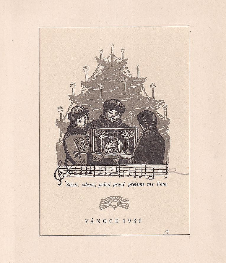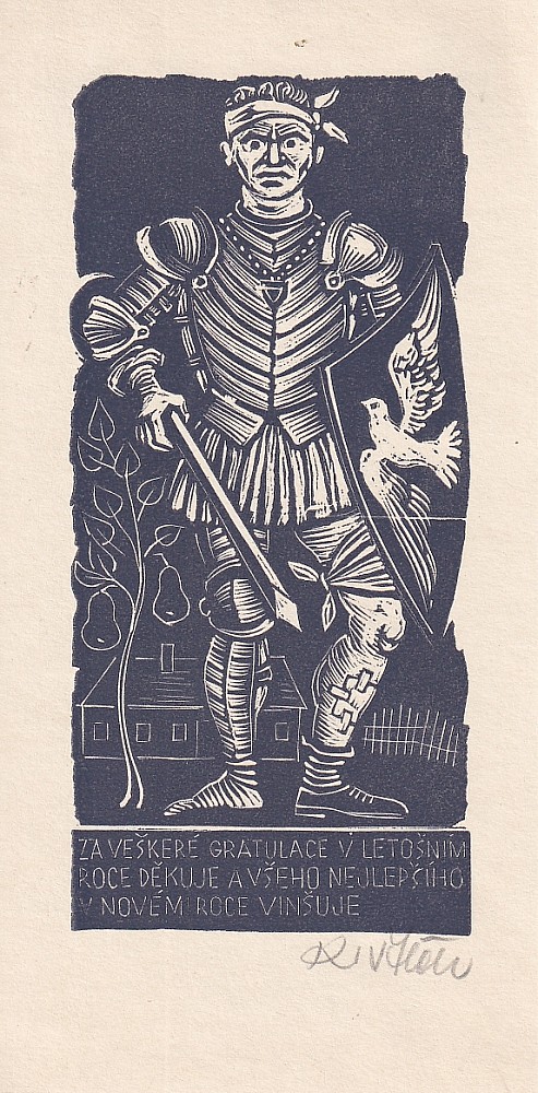 dřevoryt, 11,5 x 8,8 cm, sign. PD Vik, natištěný text: Děkuji Vám srdečně za blahopřání k mým osmdesátým narozeninám a současně Vám přeji vše nejlepší v příštím roce Vik, Provenance: Antiquarian Dlážděná, studied at The Secondary Art School of Weaving in Lomnice nad Popelkou, the disciple of prof. R…