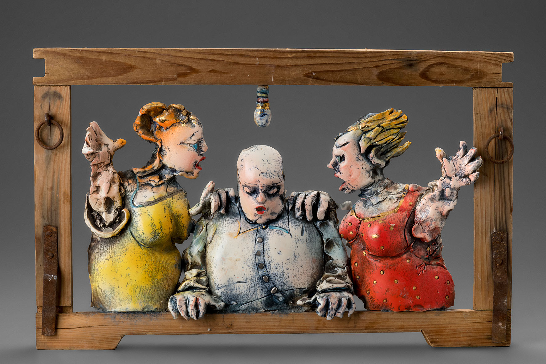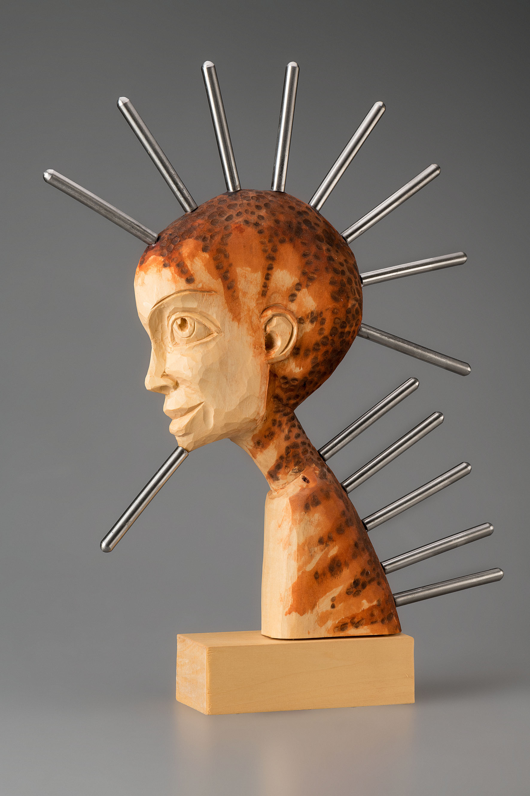 řezba z lipového dřeva s kovem, 2024, 44 x 30 cm, na soklu