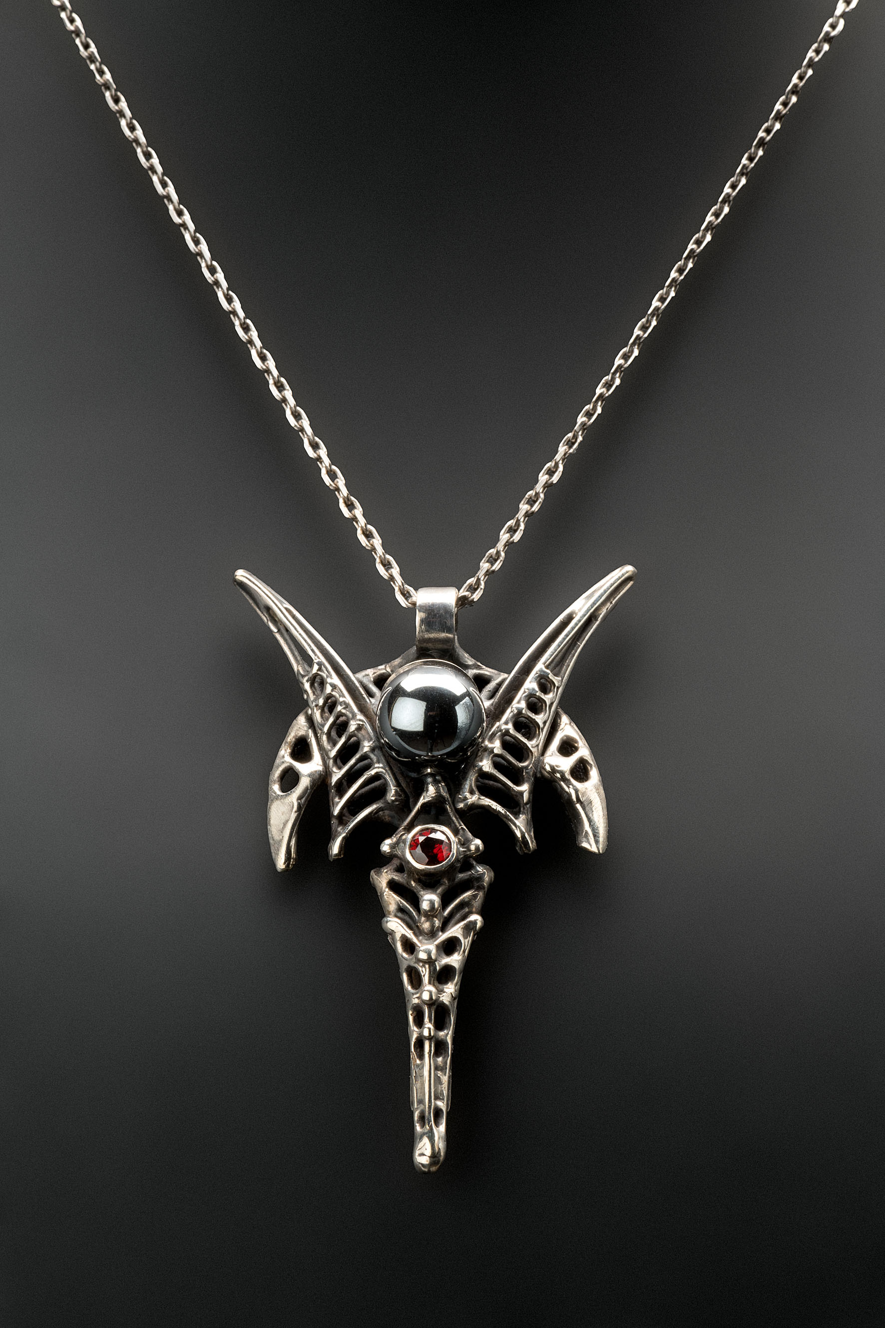 šperk ze stříbra, hematit + granát, 2023, 6,5 x 4 cm, punc + certifikát, 1/1