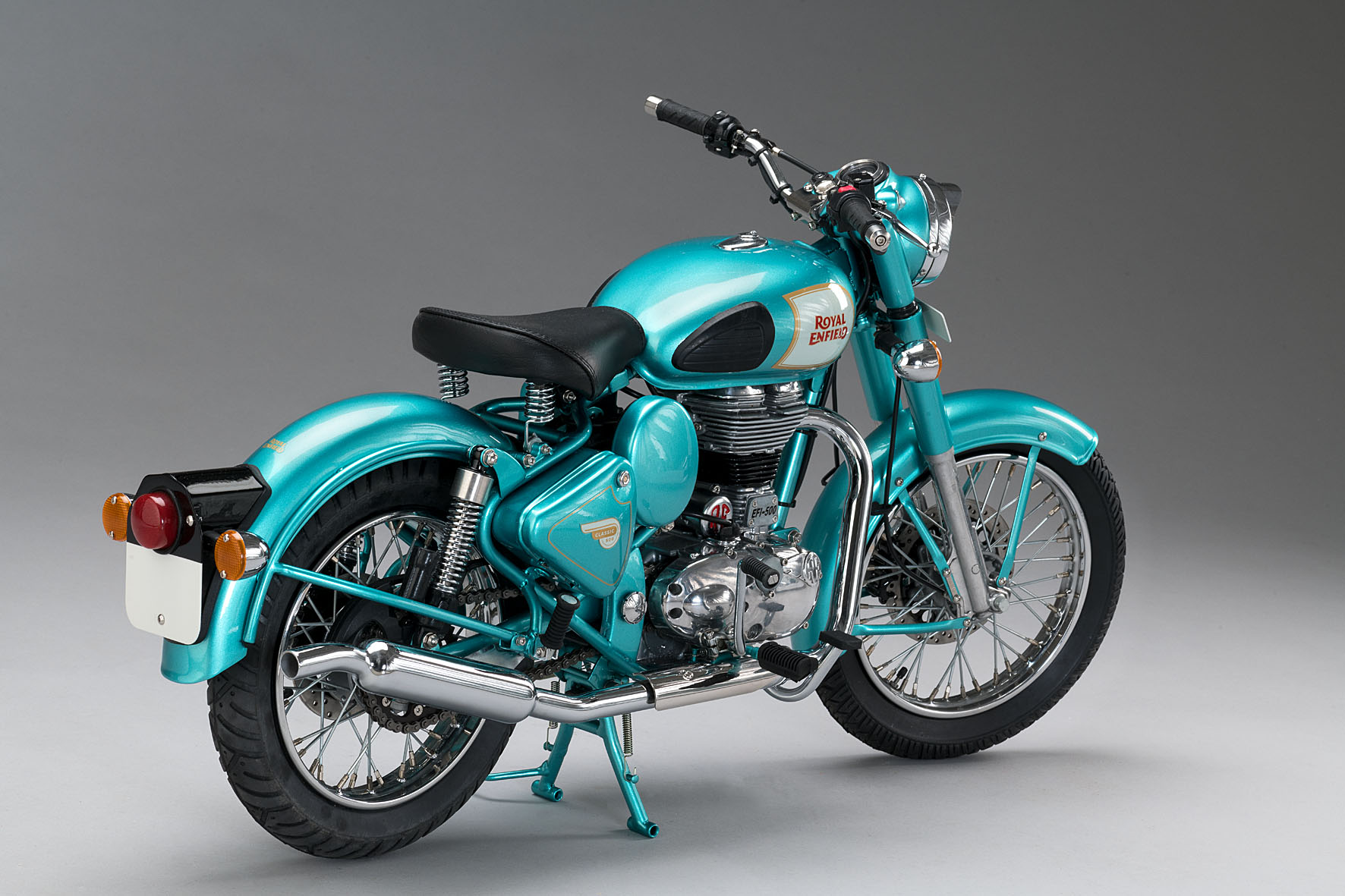 sběratelský model 1:3 motocyklu Royal Enfield Classic 500, ručně vyrobený v limitované edici z prémiových materiálů a s pohyblivými detaily (tlumiče, brzdy, řetěz aj.), které přesně napodobují originál. Model je sestavený z 964 jednotlivých dílů, v. 29; š. 73; h. 27 (řídítka) cm