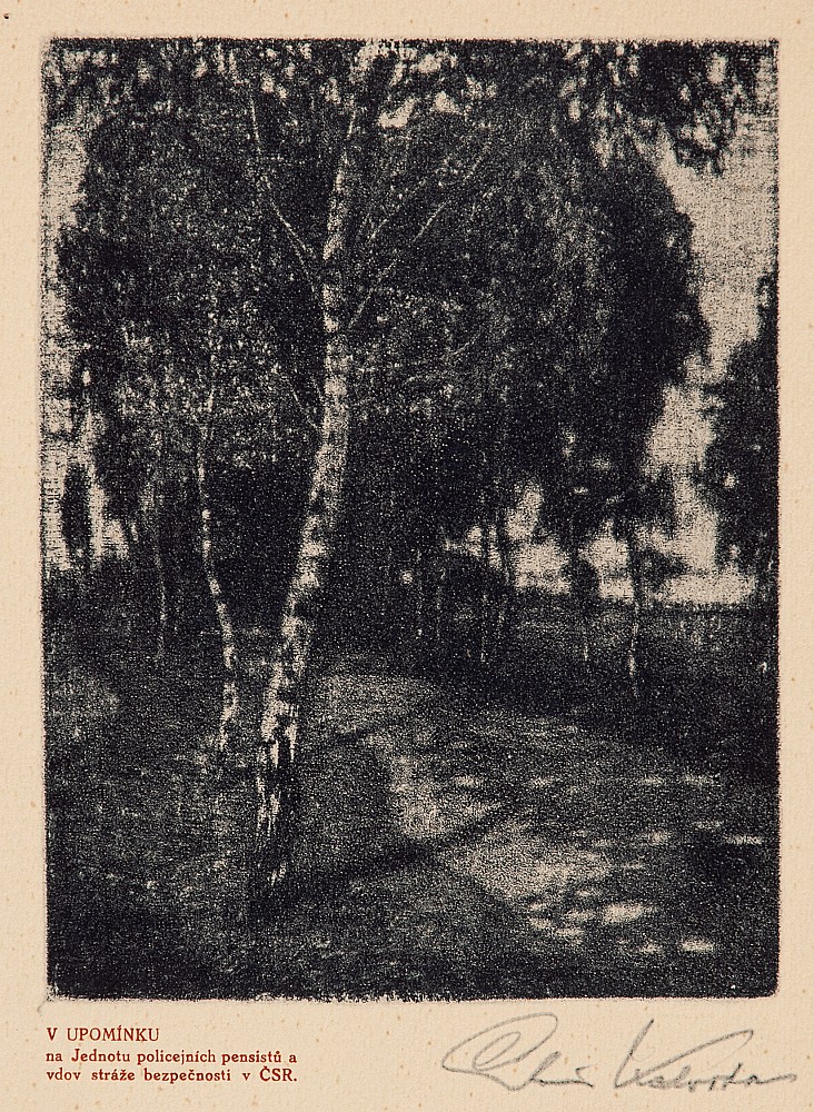 akvatinta, 17,4 x 13,2 cm, sign. PD Alois Kalvoda, V upomínku na Jednotu policejních pensistů a vdov stráže bezpečnostní v ČSR, při okrajích mimo tisk mírně zašpiněný papír, Provenance: Antiquarian Dlážděná, disciple of Prof. J. E. Mařák at the Academy of Fine Arts in Prague, member JUV, SVU Manes a…