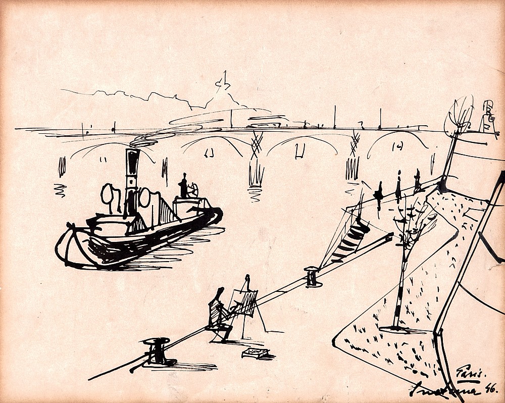 tuš, papír, 1946, 20 x 25 cm, sign. PD Smetana 46, lehce zažloutlé okraje, pomačkaný, lehce natržený papír, the disciple of prof. O. Blazicek, K. Pokorny and C. Bouda at The Faculty of Architecture - The Czech Technical University in Prague, prof. J. Benda and A. Strnadel at The Academy of Arts, Arc…