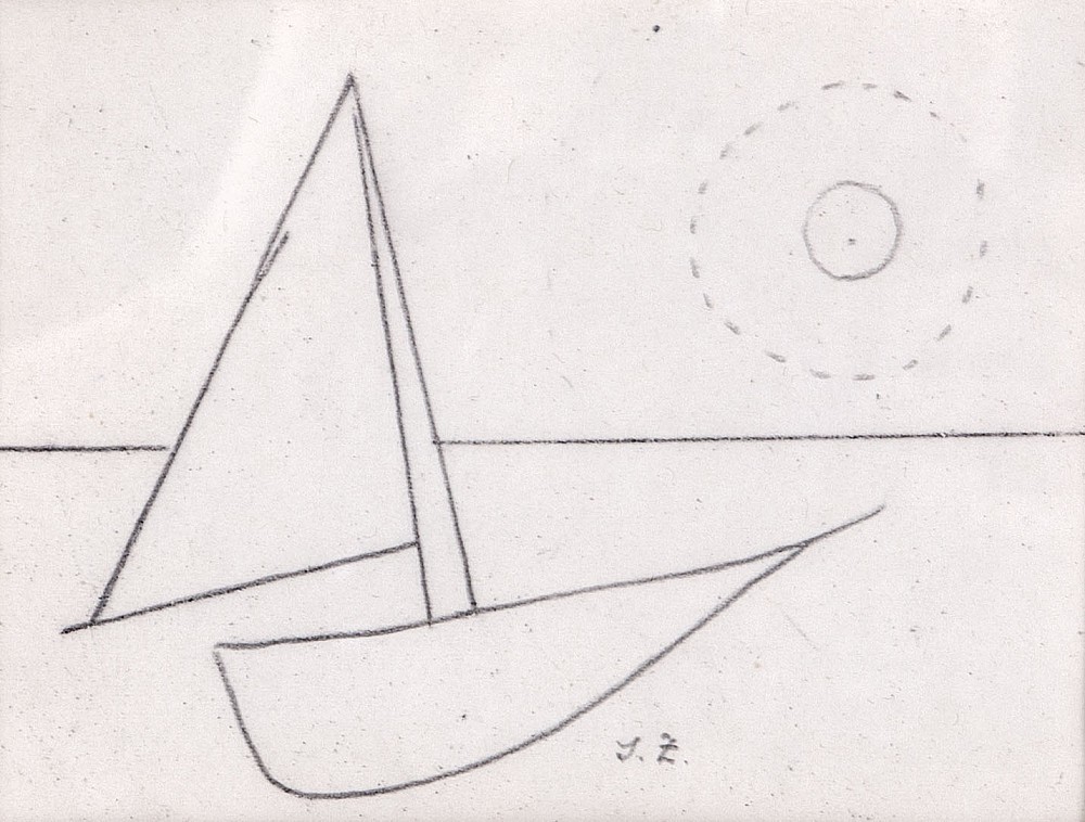 tužka, papír, 1949, 11,5 x 17 cm, monogr. PD J.Z., rám, zezadu štítek: Skály, lodi, moře, Vodňany 27.1.1949, Jan Zrzavý, Aantiqari.at Radhošťská, , the disciple of Frantisek Zenisek jr., member of Sursum, the group Tvrdosijni, The Umelecka beseda and The Manes Association of Fine Artists