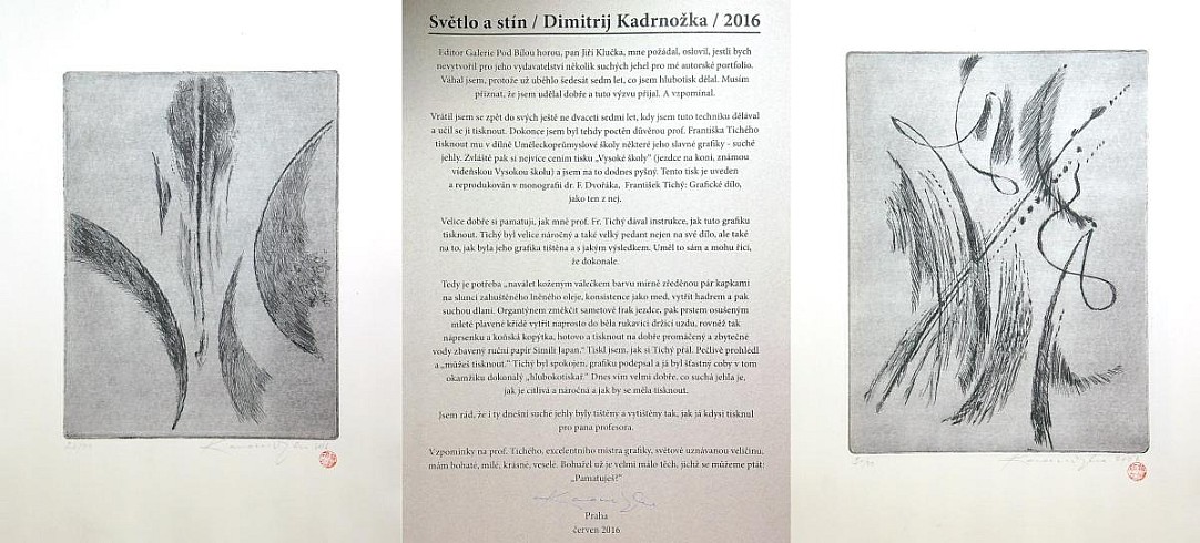 bibliofilie, 5 sign. suchých jehel D. Kadrnožka, vydala Galerie pod Bílou horou, Kopřivnice 2016, 33 výtisků, volné listy v orig. papír. přebalu, výborný stav, Antikvariát Ostrovní, žák A. Strnadela na VŠUP v Praze a F. Tröstera na AMU tamtéž, člen Jednoty umělců výtvarných