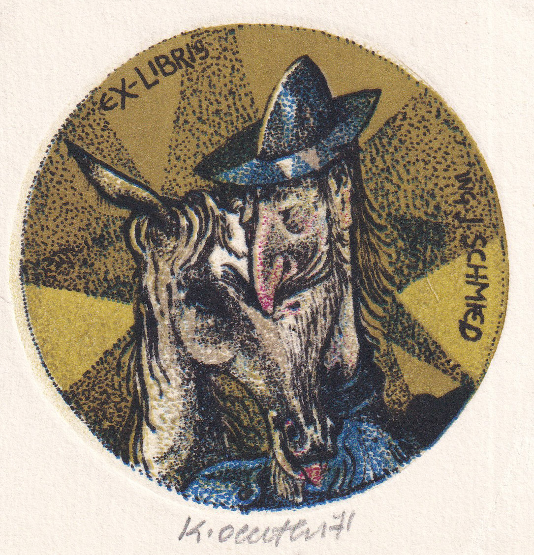 litografie, 1971, 10 x 6,5 cm, sign. DU Synec 1971, Ex libris, Antikvariát Dlážděná