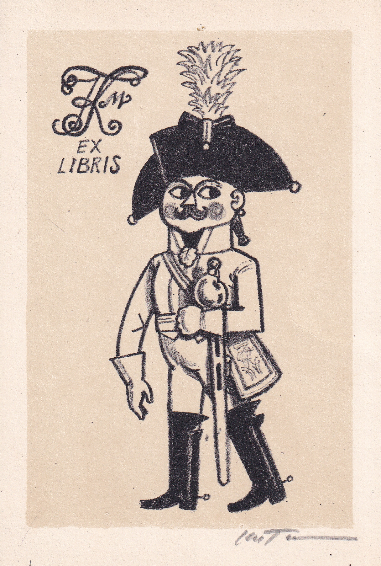 litografie, 13,4 x 8,8 cm, sign. PD Ka. Toman, Ex libris, Antikvariát Dlážděná, žák prof. V. Sychry a V. Pukla na AVU v Praze, člen SČUG Hollar