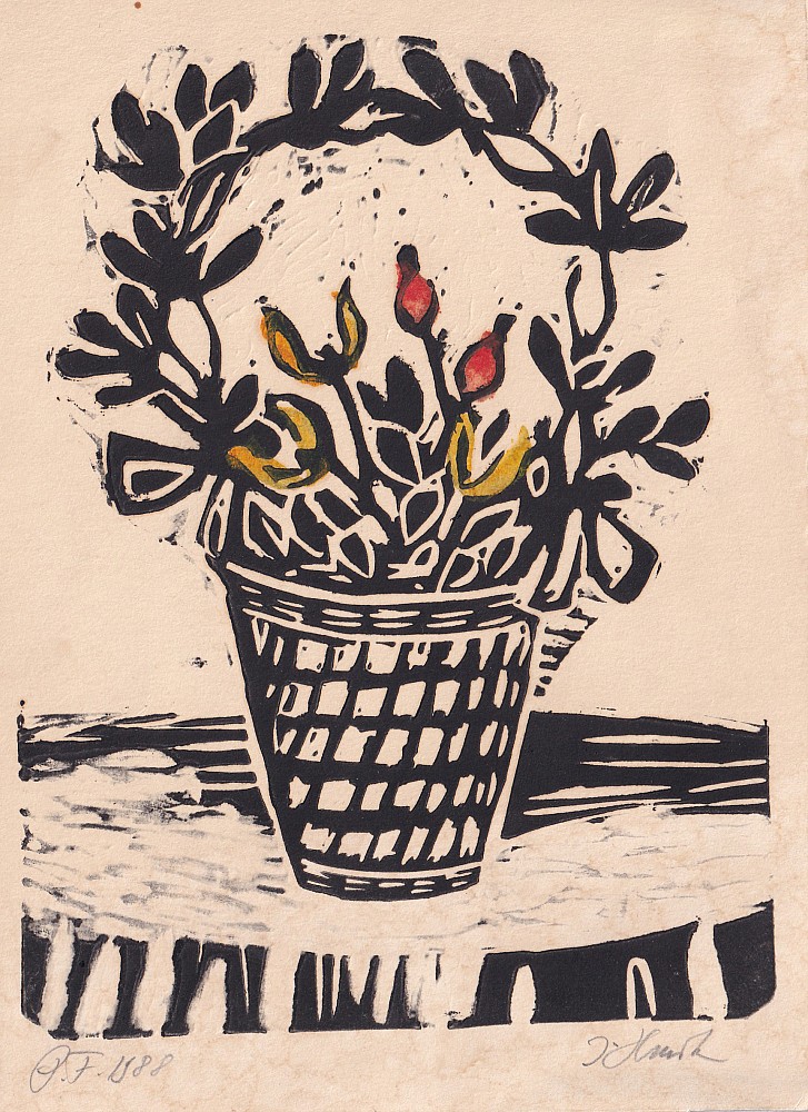 ručně kolorovaný dřevoryt, 1987, 18 x 13,5 cm, sign. PD J. Hruška, PF 1988, Provenance: Antiquarian Dlážděná