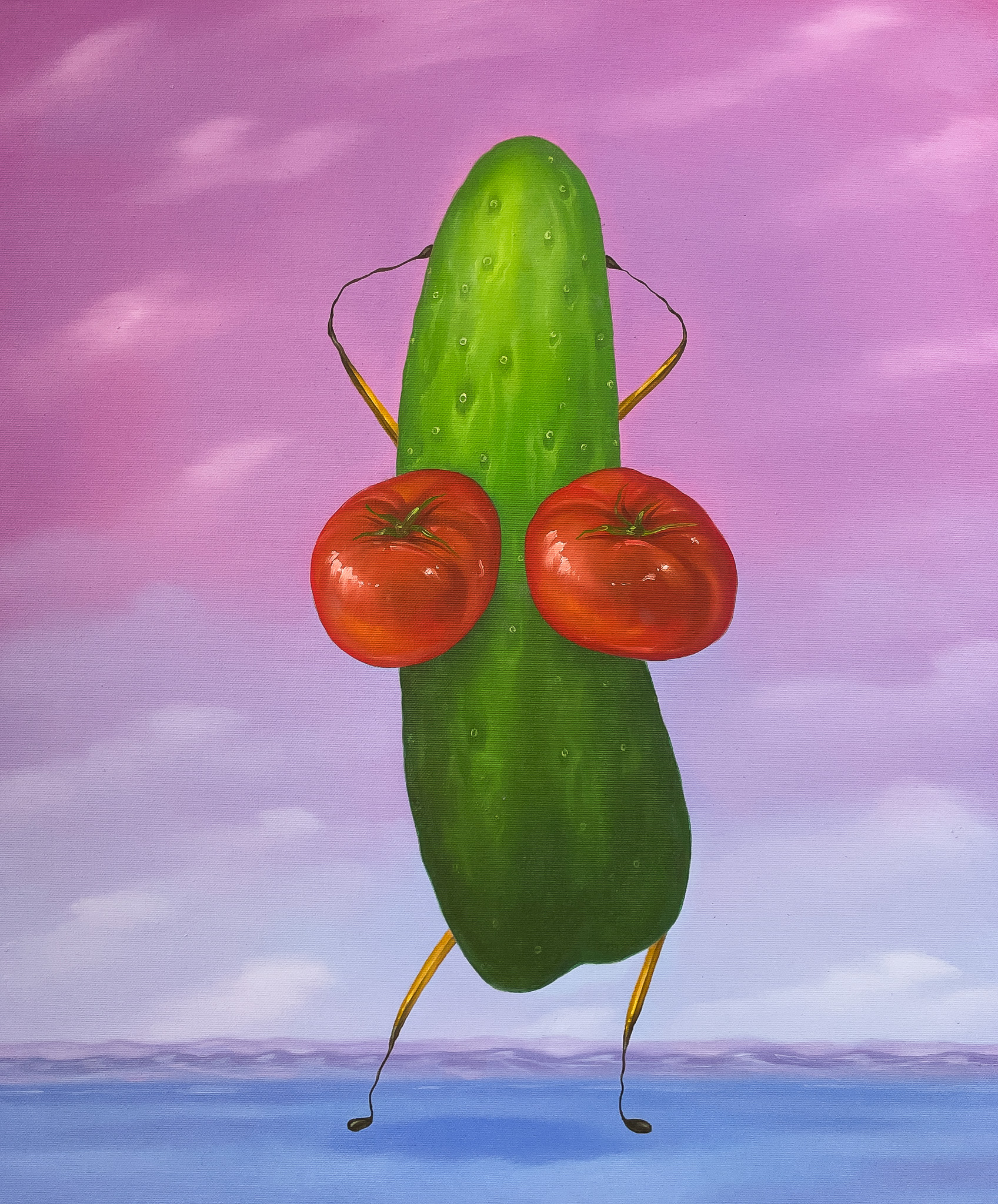 olej, plátno, 2023, 60 x 50 cm, sign. vzadu Lukáš Miffek, Lukáš Miffek je absolventem ateliéru malby u prof. Střížka a prof. Rittsteina a člen skupiny Natvrdlí. Ve své tvorbě si dokázal vytvořit zcela originální svět obývaný vyzývavými ženami, hrachovými lusky, kaktusy, fast foodem, roboty a dalšími…