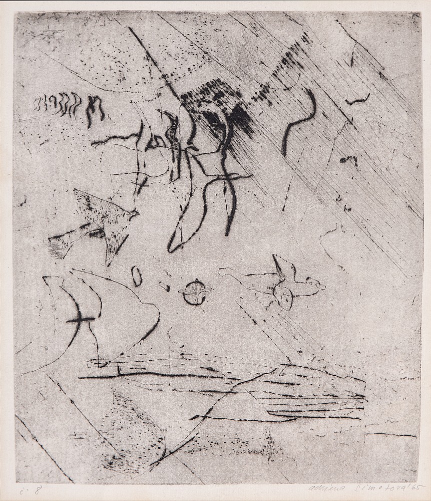 suchá jehla, 1965, 24,5 x 21,4 cm, sign. PD Adriena Šimotová 65, rám, č. 8, na trhu velmi raritní ukázka ranné grafické práce Adrieny Šimotové z 60. let, kdy se autorka ve své tvorbě uchyluje k médiu papíru. Jedná se o jednu z prvních grafických prací., the disciple of prof. J. Svab at Officina Prag…