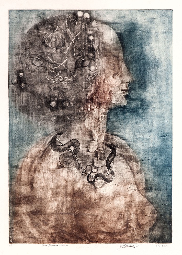 mezzotinta, 1974, 51,5 x 36,5 cm, sign. PD Jiří Anderle, rám, ve svých grafických a obrazových cyklech vytvořil Jiří Anderle působivé podobenství současného člověka v jeho kontextech mytologických, historických, sociologických. V letech 1955–1961 studoval na VŠUP a AVU v Praze, obor malba a grafika …