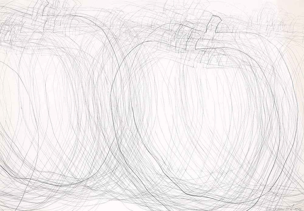 tužka, papír, 1972, 61 x 88 cm, sign. PD Eva Kmentová 1972, rám, "Kmentové nejde o introspekci; objektivizuje v konkrétním prostoru a čase. Svědčí o tom i řada kreseb, v nichž sleduje jediným souvislým tahem kontury určitého předmětu nebo paže, ruky, nohy, " aby do nich vepsala," jak …
