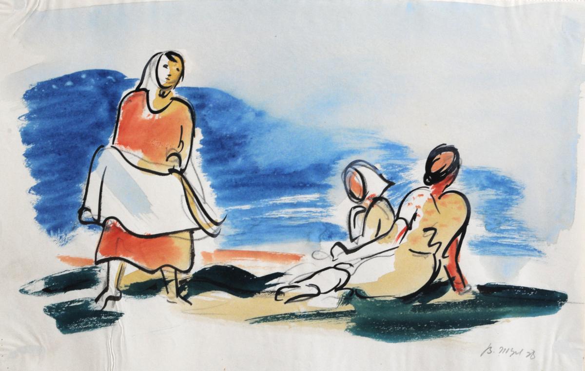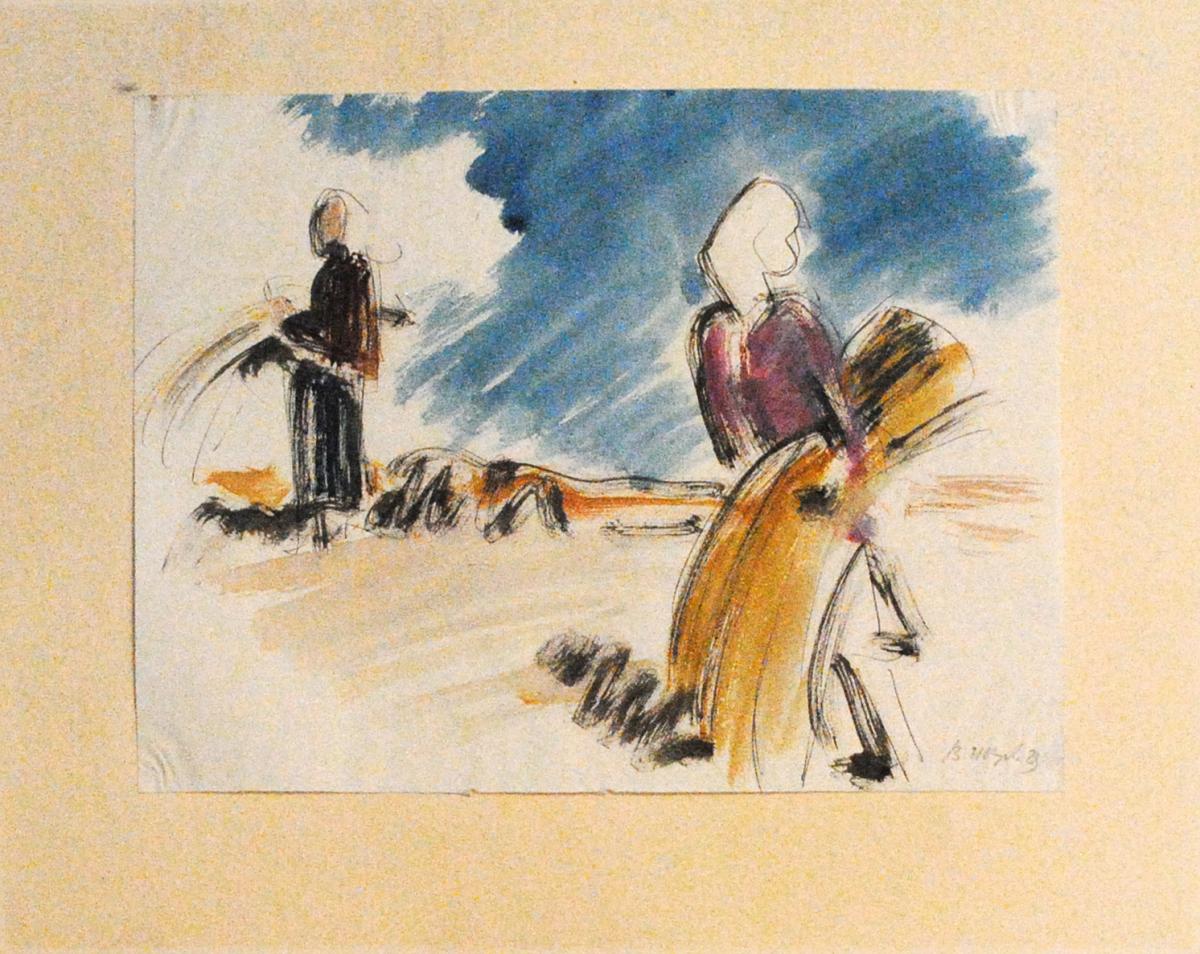 tužka, akvarel, papír, 1937, 18,5 x 13 cm, sign. PD B. Ullrych 1937, nalepeno na kartonu, vzadu popsáno, pokrčený papír, Aantiqari.at Radhošťská, ,