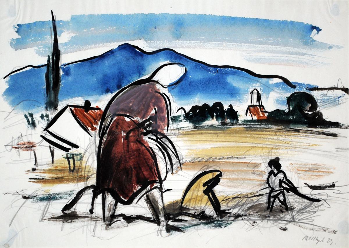 tužka, akvarel, papír, 1929, 35,5 x 49 cm, sign. B Ullrych 29, nalepeno na kartonu, Aantiqari.at Radhošťská, ,