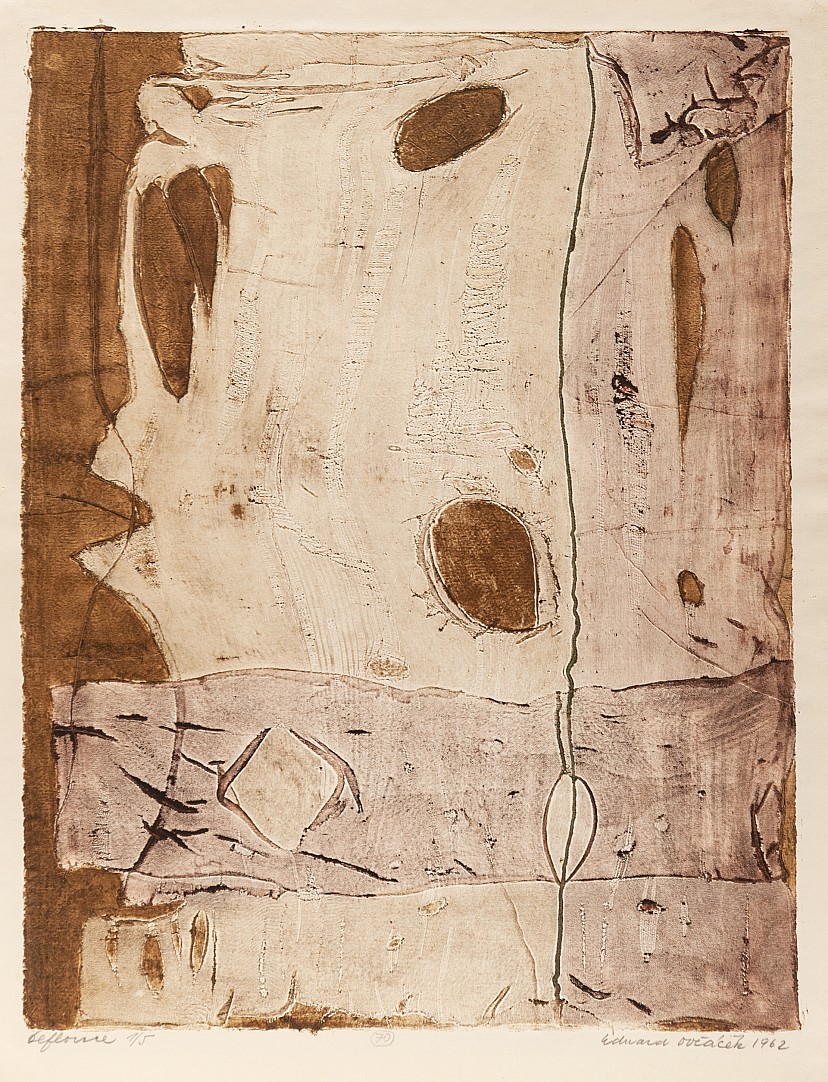 strukturální grafika, lept, 1962, 50,5 x 39,4 cm, sign. PD Eduard Ovčáček 1962, rám, č. 1/5, Eduard Ovčáček se ve své tvorbě zabýval malbou, grafikou, koláží, plastikou, vizuální a konkrétní poezií, lettristickou fotografií, akcemi a instalacemi. Jeho prvořadým mediem se ale stala grafika, kterou ča…