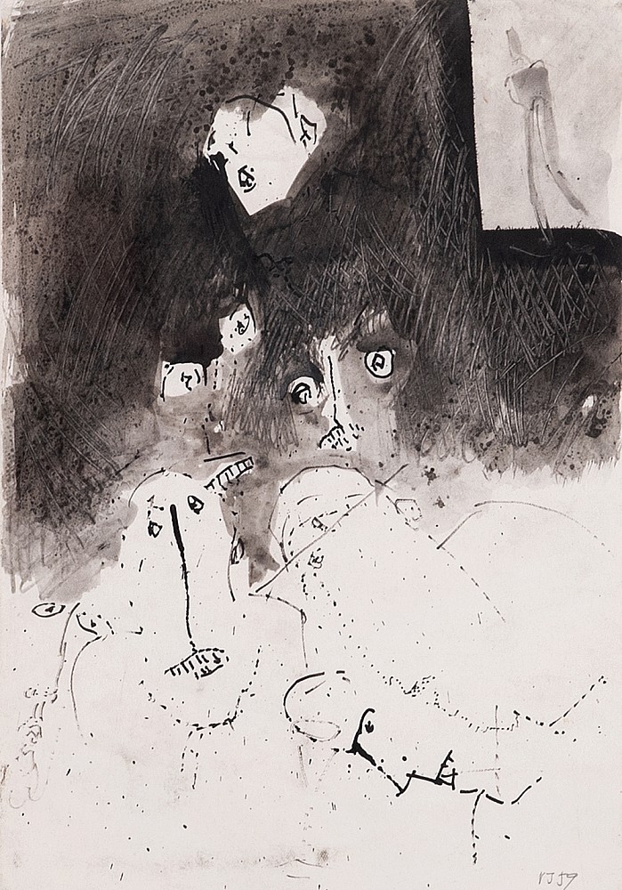 tuš, papír, 1959, 29,8 x 20,8 cm, sign. PD VJ59, rám, Vladimír Janoušek (1922–1986) patří k výrazným osobnostem českého poválečného sochařství a malby, jehož dílo se vyznačuje silnou figurální imaginací, existenciálním napětím a osobitým vztahem k prostoru a pohybu. Studoval na Vysoké škole umělecko…