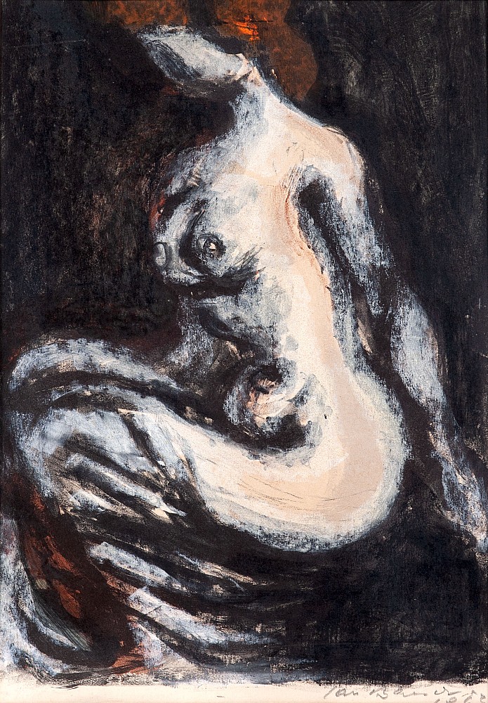 kvaš, papír, 1963, 40 x 28,5 cm, sign. PD Jan Bauch 1963, rám, vysoce působivá ukázka z ruky všestranného umělce, který se vyučil řezbářem, poté vystudoval UMPRUM a u M. Švabinského také pražskou AVU. Jako mladý muž prošel zákopy světové války, což mělo na jeho tvorbu pochopitelně velký vliv. Z počá…