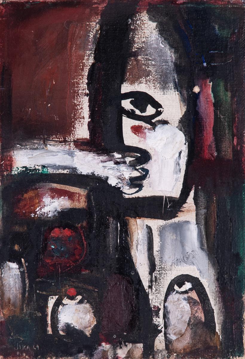 olej, plátno na dřevě, 1968, 23,5 x 16,5 cm, sign. LD Jíra 69, obraz je typickou ukázkou expresivního rukopisu malíře Josefa Jíry. Kompozice je vystavěna z výrazných tmavých linií, které fragmentují prostor a zároveň naznačují stylizovanou lidskou tvář. Autor pracuje s kontrastem mezi hutnými, téměř…