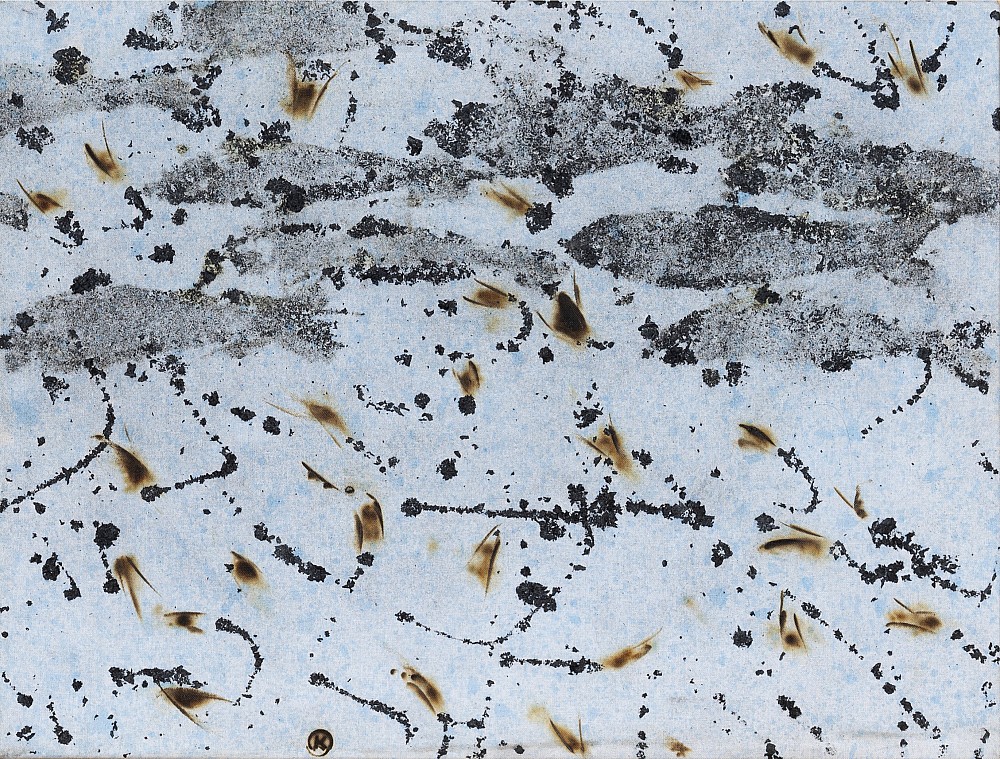 popel, oheň, plátno, 2022, 30 x 40 cm, sign. DU K, Svatopluk Klimeš vystudoval Akademii výtvarných umění v Praze (1967–1973) a kromě vlastní tvorby vyučoval od roku 1998 kresbu a malbu na Univerzitě J. E. Purkyně v Ústí nad Labem. Klimeš je znám svými propalovanými obrazy, kdy médium malby posunul d…