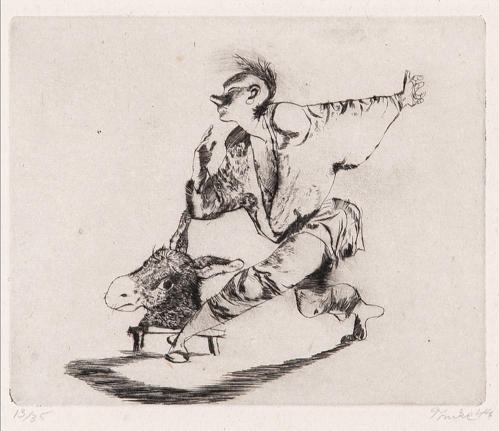 suchá jehla, papír, 1944, 13,5 x 16,5 cm, sign. PD Trnka 44, č. 13/35, dílo legendárního českého výtvarníka, ilustrátora a scénáristy Jiřího Trnky. Svými poetickými ilustracemi doprovodil desítky knih pro děti, např. sbírku pohádek K. J. Erbena, Karafiátovy broučky, Slovenské národní pohádky či Pohá…