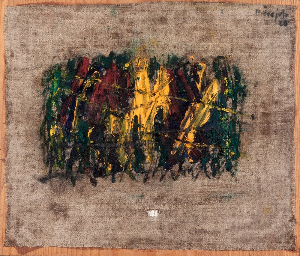 olej, plátno, nalepeno na dřevě, 1988, 22,5 x 26 cm, sign. PN M. Šnajdr 88, Miroslav Šnajdr patří mezi solitéry českého výtvarného umění, k umělcům působícím mimo velká kulturní centra. Ve své tvorbě zůstal věrný svému přesvědčení a názoru. Abstraktní obrazy Miroslava Šnajdra vycházejí z bohaté škál…