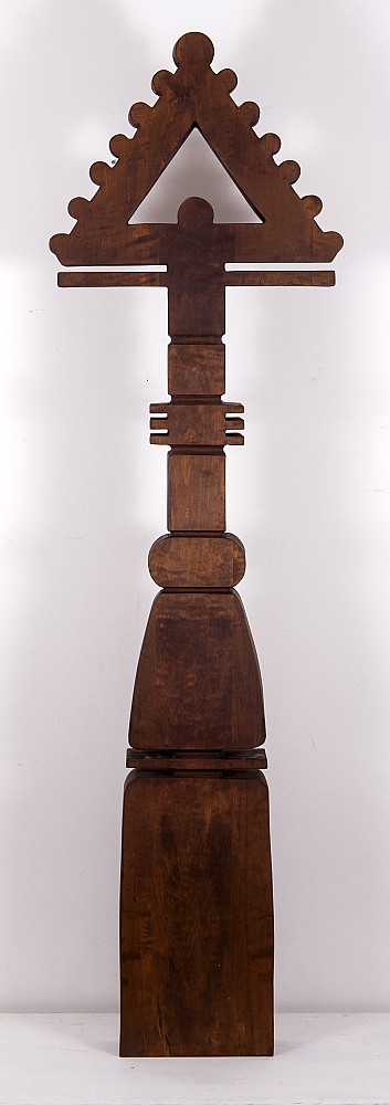dřevo, v. 204 cm, sign. zespodu V. Kompánek, slovenský sochař a malíř absolvoval na Vysoké škole výtvarných umění v Bratislavě. Pro jeho tvorbu je charakteristické sepjetí s přírodou, prostředím lidové architektury a geniem loci. V malbě se inspiroval zejména venkovským životem a tradicemi. Často z…