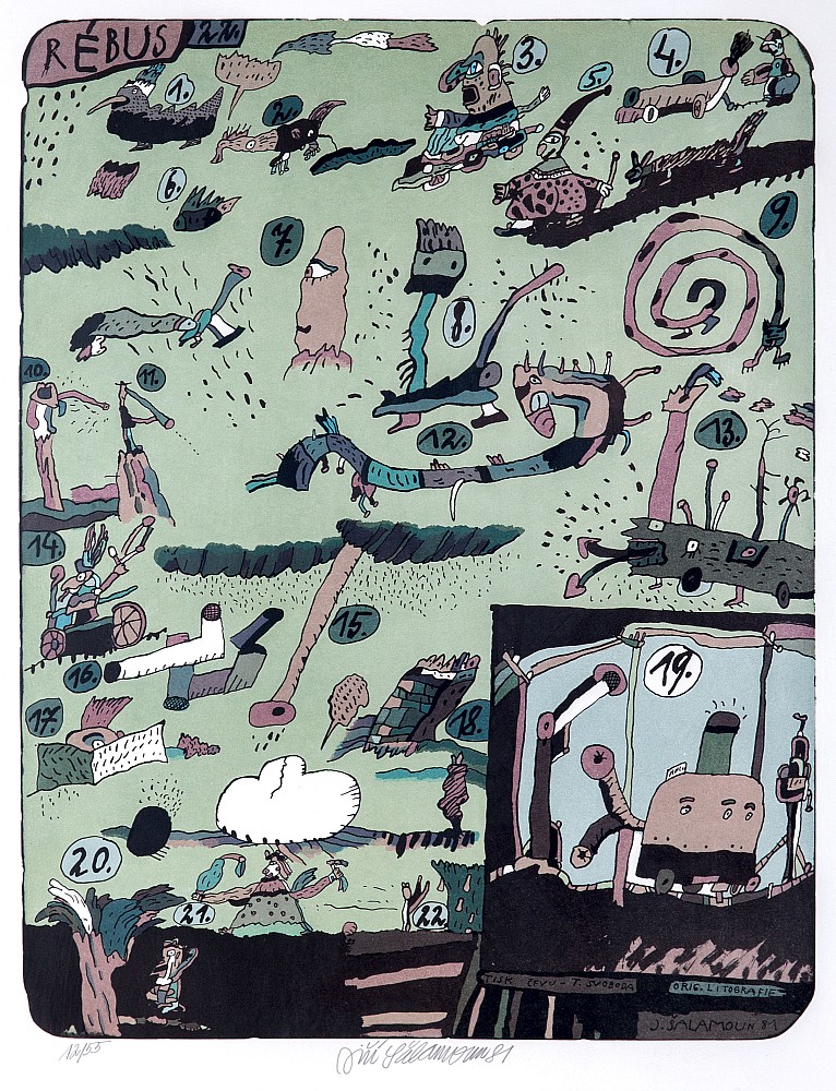 litografie, 1981, 48,5 x 47,5 cm, sign. DU Jiří Šalamoun 81, rám, č. 12/55, Aantiqari.at Radhošťská, , the disciple of prof. V. Silovsky and V. Pukl at The Academy of Fine Arts in Prague, prof. A. Kapr and G. K. Muller at The Academy of Graphics and Typographical Arts in leipzig, member of The Holla…